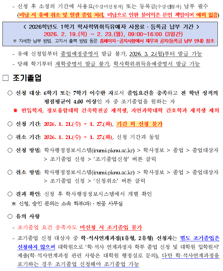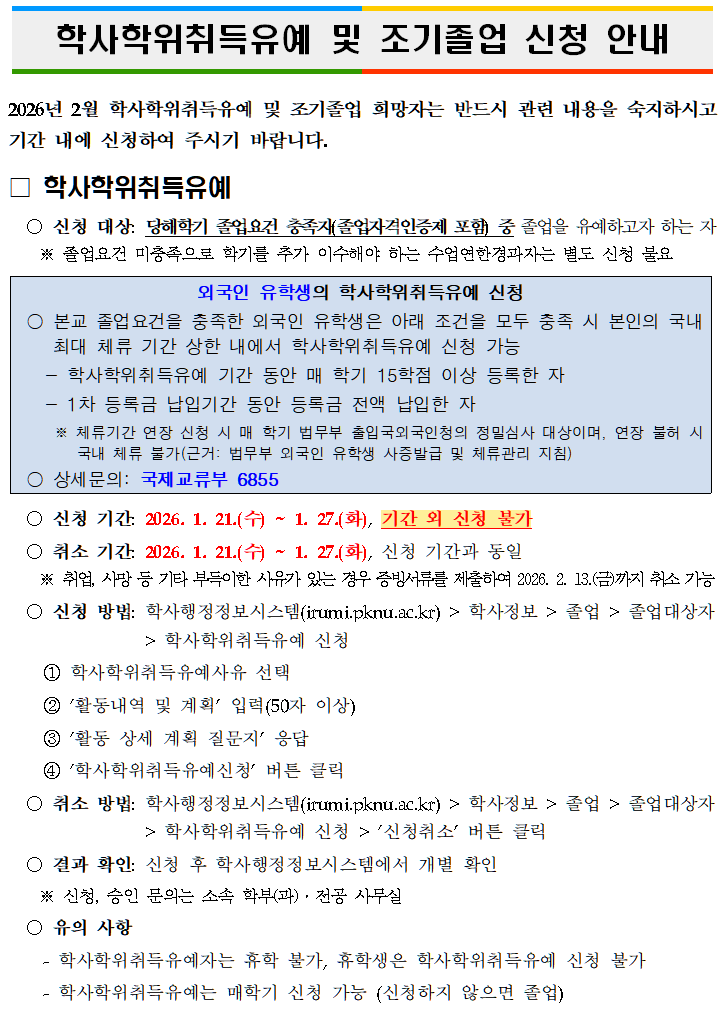 2026년 2월 학사학위취득유예 및 조기졸업 계획 알림