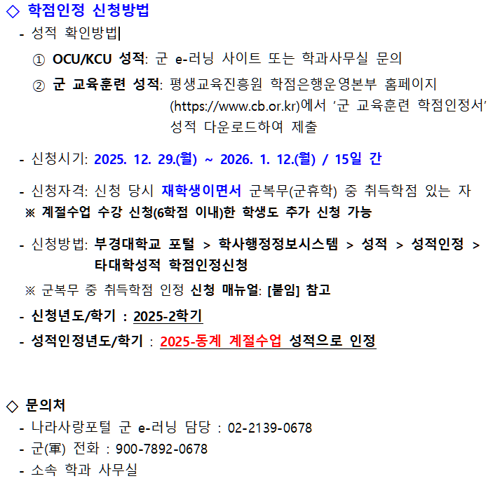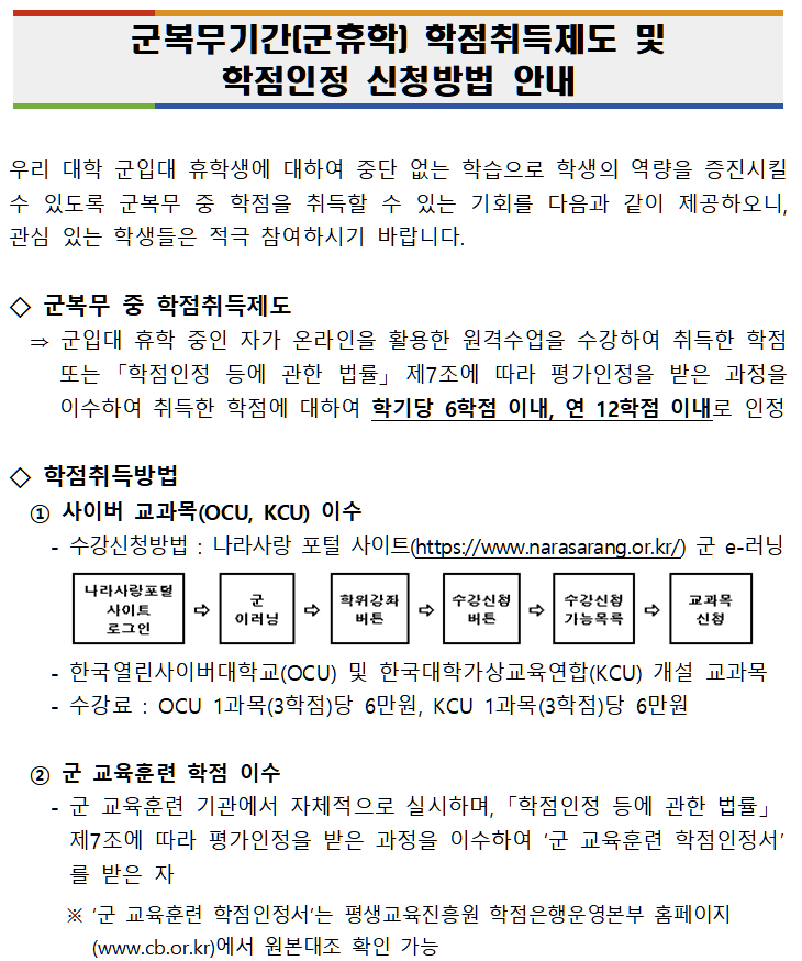 군복무기간(군휴학) 학점취득제도 및 학점인정 신청방법 안내