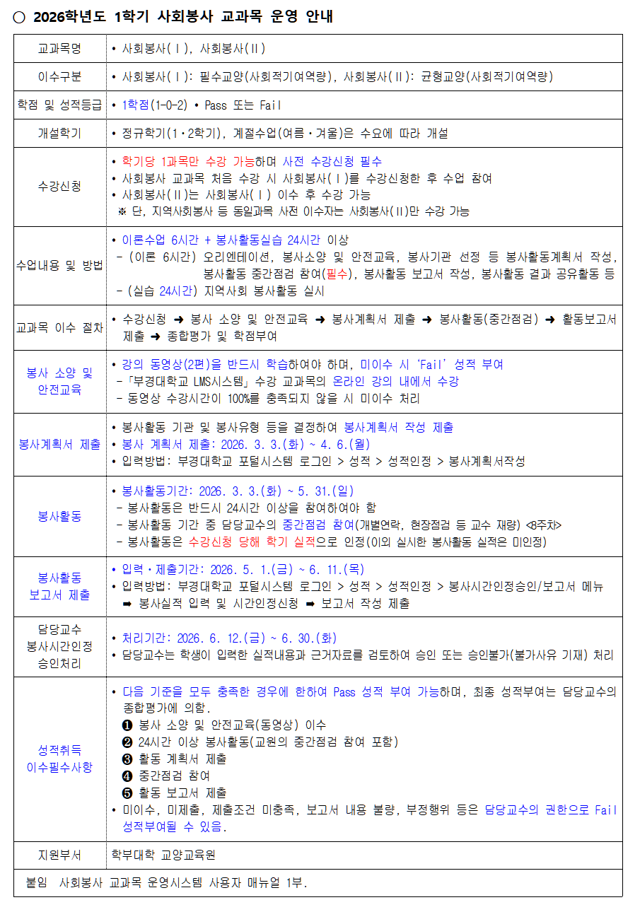 2026학년도 1학기 사회봉사 교과목 운영 안내