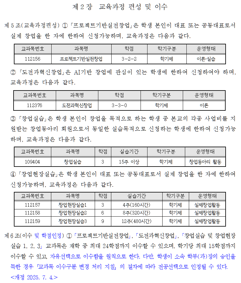 | [프로젝트 기반 창업실습 교과목 운영세칙] 개정 알림 및 이수구분 변경 안내 (전공선택 → 자유선택) | |||