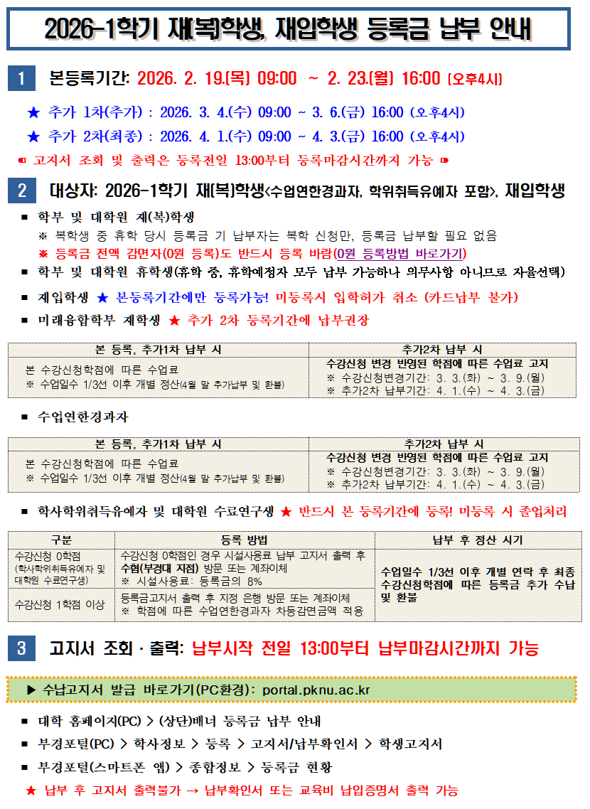 | 2026-1학기 재(복)학생, 재입학생 등록금 납부 안내 | |||