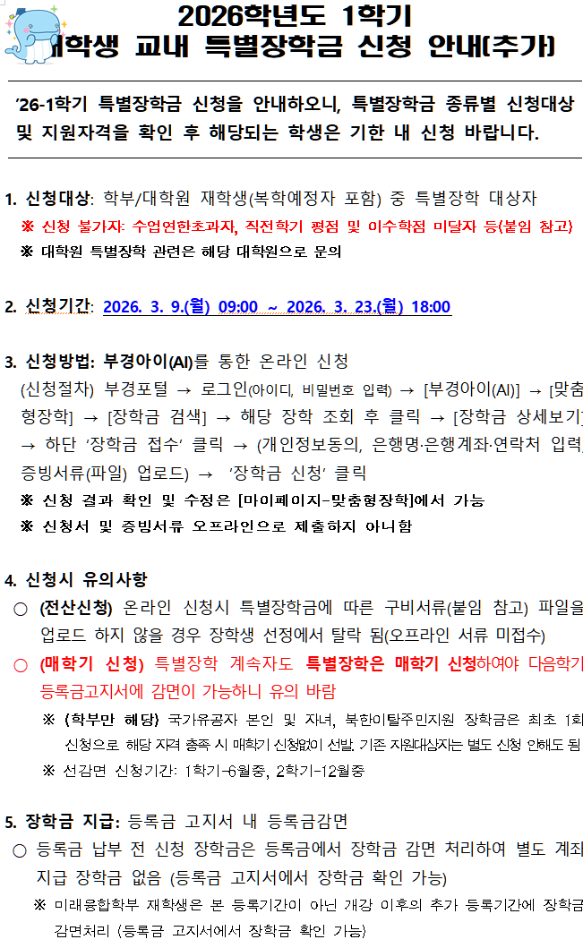 | ’26-1학기 교내 저소득층 및 특별장학생 추가 선발계획 안내 | |||