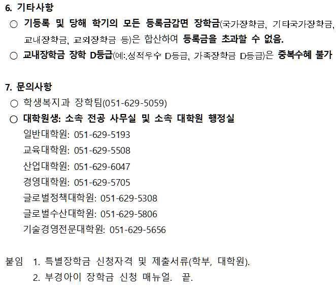 | 첨부파일 | (붙임8) 부경아이 장학금 신청 매뉴얼.pdf (붙임3) 특별장학금 신청자격 및 제출서류(학부)(추가).hwp (붙임4) 특별장학금 신청자격 및 제출서류(대학원)(추가).hwp (붙임9) 국립부경대학교 장학운영지침(개정 2023.12.27.).hwp | ||